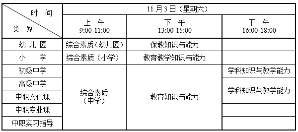 2018下半年江苏中小学教师资格证笔试报名时间公告 根据《关于2018年下半年中小学教师资格考试考务相关事项的通知》(教试中心函〔2018〕114号)精神,现将我省今年下半年中小学教师资格考试(笔试)有关事项公告如下。 一、报考条件 符合以下基本条件的人员,可以在我省报名参加教师资格考试: (一)具有中华人民共和国国籍; (二)具有 ①江苏户籍②人事关系在江苏(须与用人单位签订一年以上聘用合同并由用人单位缴纳社会保险)③江苏省内普通高等学校全日制在读(①②③条件满足其一即可); (三)遵守宪法和法律,热爱教育事业,具有良好的思想品德; (四)符合江苏省教师资格认定体检标准; (五)符合《教师法》规定的学历要求: 1. 报考幼儿园、小学、初中教师资格的,应当具备大学专科及以上学历(其中具有中等幼儿师范学校学历可以报考幼儿园教师资格,具有中等师范学校学历可以报考小学教师资格); 2. 报考高级中学教师资格的,应当具备高等师范院校或者其他大学本科及以上学历; 3.报考中等职业学校文化课、专业课教师资格的,应当具备高等师范院校或者其他大学本科及以上学历; 4. 报考中等职业学校实习指导教师资格的,应当具备普通中等职业学校毕业及其以上学历,并具有相当助理工程师及以上专业技术职务或者中级及以上工人技术等级。 普通高等学校全日制在校三年级及以上学生和五年制高等职业学校全日制在校四年级及以上学生可以报考。 被撤销教师资格的人员,5年内不得报名参加考试;受到剥夺政治权利,或故意犯罪受到有期徒刑以上刑事处罚的,不得报名参加考试。参加教师资格考试有作弊行为的,3年内不得再次参加教师资格考试。 二、报名要求 1.考生登录中小学教师资格考试网站(http://ntce.neea.edu.cn)进行网上报名,网上审核,网上缴费,各时间节点如下: 网上报名时间:9月4日-9日; 网上审核时间:9月10日-12日; 网上缴费时间:9月10日-14日,14日截止到24时; 准考证打印时间:10月29日-11月3日; 考试时间:11月3日。 2.考生报名的应试考区应选择以下三项之一:①户籍所在地级市考区②人事关系所在地级市考区③学籍所在地级市考区。南京地区考生就近选择具体区县。具体考试地点以考生下载的准考证上地址为准。 3. 考生报名时上传照片必须满足以下要求: (1)本人近6个月以内的免冠正面白底彩色证件照,照片中显示考生头部和肩的上部,不允许带帽子、头巾、发带、墨镜; (2)照片文件不大于200K,格式为jpg/jpeg; (3)照片将用于准考证及考试合格证明,请考生上传照片时慎重选用。考生如上传照片不符合要求,将不能通过审核。 4.考生对网上报名时所填写内容的真实性、有效性、规范性负责,对是否符合报考条件和要求负责。在报名期间前可对报名信息进行多次修改,网上审核一经通过,考生信息不得更改。 5. 考生自9月10日至12日可登陆网站查看个人审核情况。通过审核后,请及时进行网上缴费,缴费时间截止到9月14日24时,逾期未缴费者视为放弃考试。根据苏价费函〔2014〕25号文件精神,我省中小学教师资格考试收费标准为:笔试纸质考试每人每科52元。 三、考试说明 1.所有科目全部为纸笔考试。 2.考试各科目日程安排如下: 3.根据《教育部教师工作司关于中小学教师资格考试音、体、美专业考生公共科目单独编码的通知》(教师司函〔2017〕34 号)文件精神,从2017年下半年考试开始,对音、体、美专业考生的笔试公共科目一、科目二(科目代目:201、202、301、302)实行单独编码(相应科目代码: 201A、202A、301A、302A),考试内容暂与原科目相同。 实行单独编码后,音、体、美专业考生在笔试报名时应选报单独编码的公共科目。取得科目201A、202A 合格的考生,面试仅限于参加小学类别音、体、美专业科目; 取得科目301A、302A合格的考生,面试仅限于参加初中、高中、中职类别音、体、美专业科目。考生已获得科目201、202、301、302合格成绩,可相应替代科目201A、202A、301A、302A合格成绩; 考生已获得科目201A、202A、301A、302A合格成绩不可替代科目201、202、301、302合格成绩。 4. 根据《教育部教师工作司关于中小学教师资格考试增加“心理健康教育”等学科的通知》(教师司函〔2017〕41号)精神,中小学教师资格考试自2017年下半年起初中、高中、中职文化课类别增设“心理健康教育”“日语”“俄语”学科; 小学类别面试增设“心理健康教育”“信息技术”“小学全科”学科。 上述各类别新增学科的笔试科目一、科目二与已开考学科一致,初中、高中、中职文化课类别新增学科的笔试科目三《学科知识与教学能力》结合面试一并考核。经教育部同意,我省暂不开考“俄语”和“小学全科”学科。 四、特别提醒 1. 考生本人通过教师资格考试网上报名系统进行报名,禁止培训机构或学校团体替代考生报名。如因填报信息有误或填报虚假信息,导致无法参加教师资格考试或教师资格认定,考生责任自负。 2.考生如忘记密码可通过报名系统提示操作,报名系统将把新的密码通过短信发送到考生报名时所填报的手机上。手机短信为考生重新获取密码的重要途径,在参加中小学教师资格考试期间,请考生不要更换手机号码。 3.考试不举办培训,亦不指定教材,考生可登录中小学教师资格考试网下载各科目的《考试标准》和《考试大纲》等相关信息自行复习备考。 五、成绩